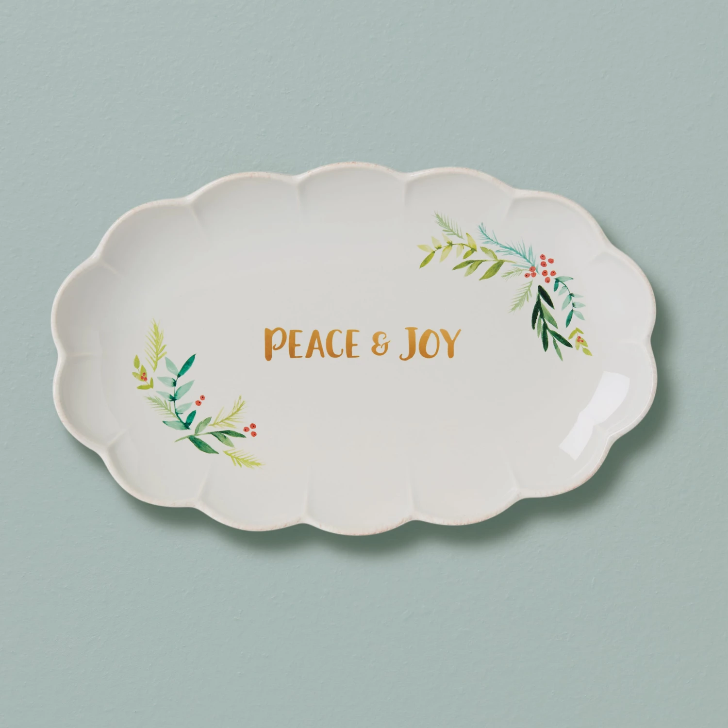A festive fresh spin on the French Perle favorites. This platter features a wreath of artistic holiday holly with leaves, branches, and berries in a handpainted style around the words “Peace & Joy”. Crafted with smooth scallops on a snowy white base for a creative winter feel.