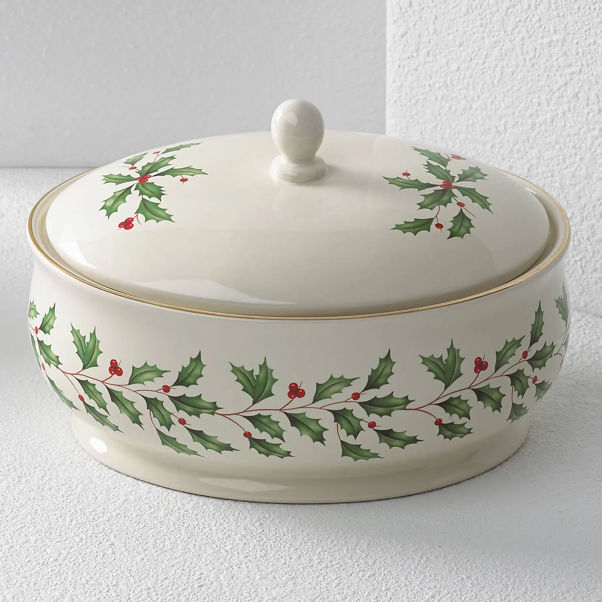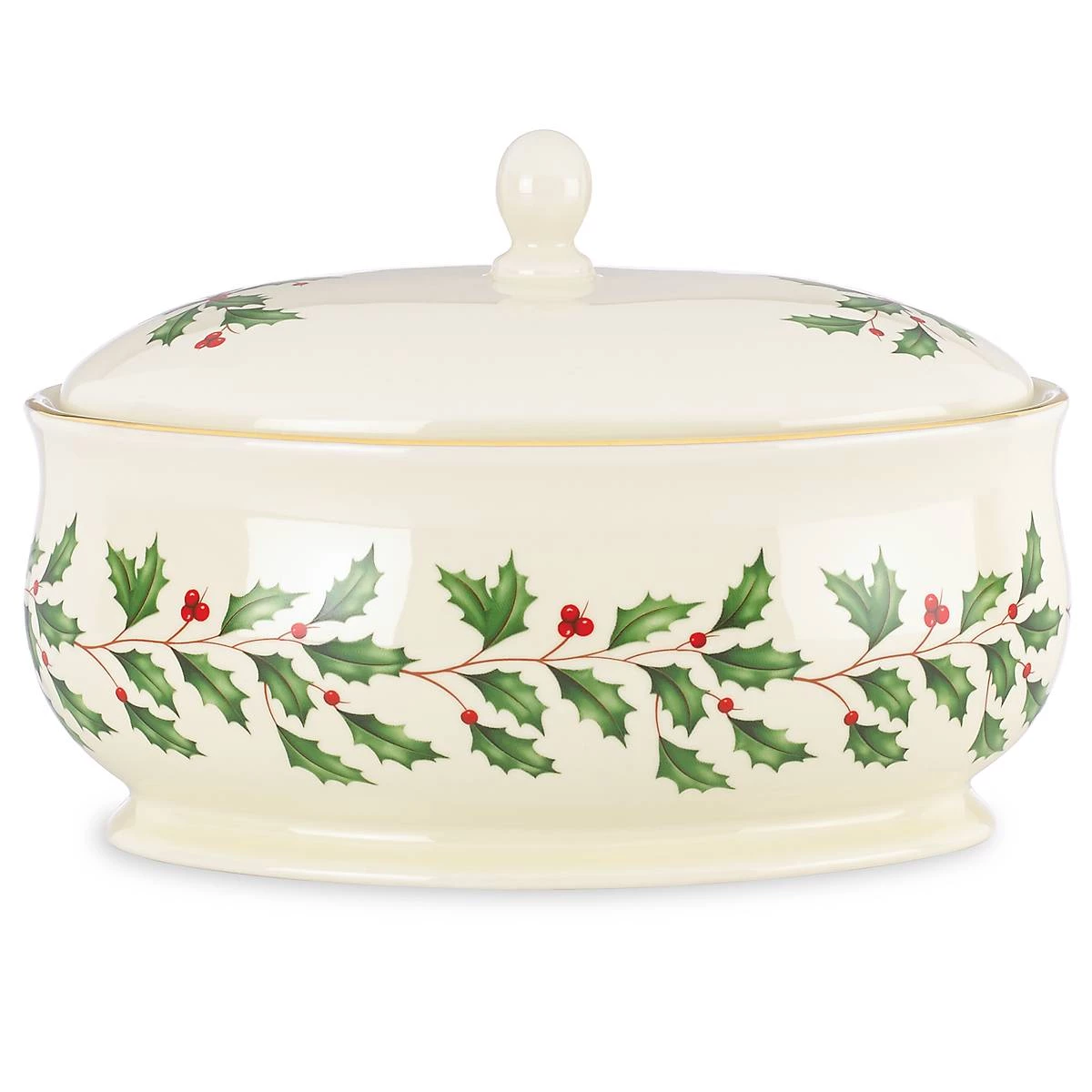 The elegant and spacious Holiday Covered Dish makes hosting holiday meals easier. The ceramic dish features 24-karat gold accents and is decorated with Lenox’s iconic holly and berries motif.