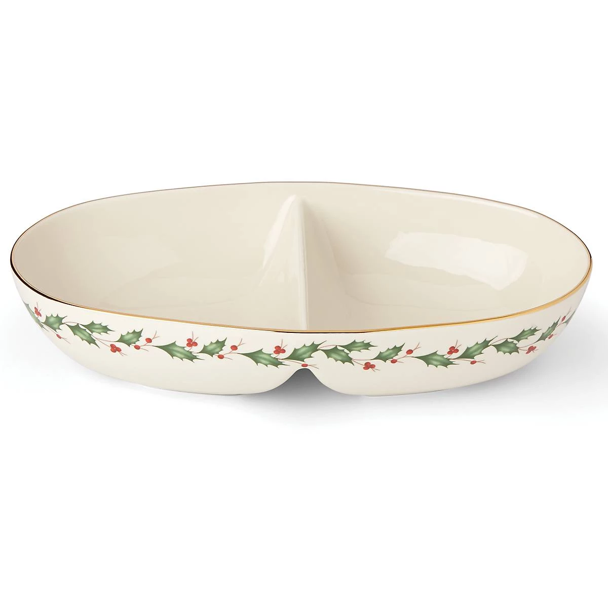 This two-part, divided ceramic serving bowl allows you to present two complementary dishes at once. The playful holly design and 24-karat gold accents will keep the table festive and vibrant.