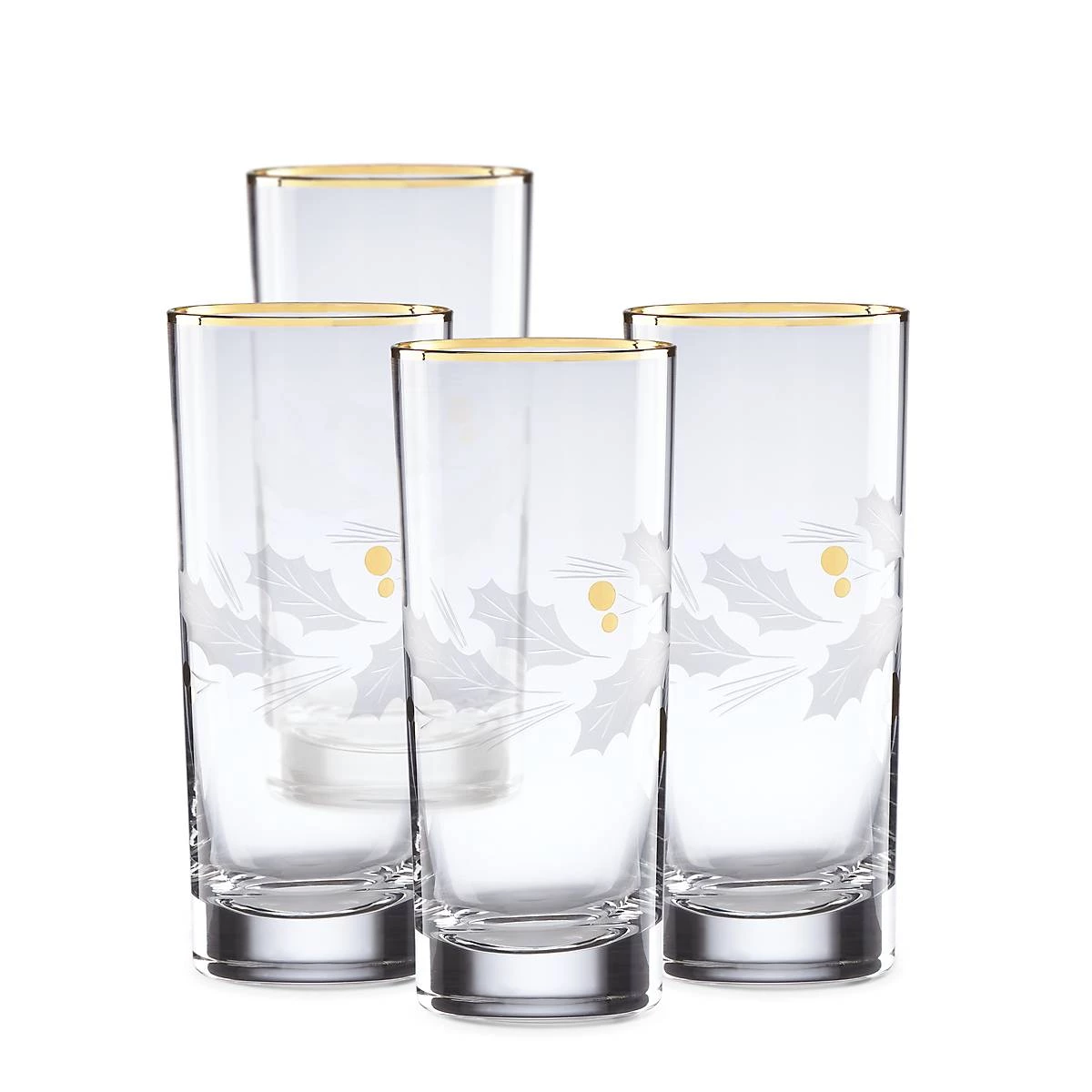 Etched holly leaves with golden berries form an elegant holiday pattern on this 4-piece highball glass set. A delicate gold finish creates a polished design around the rim.