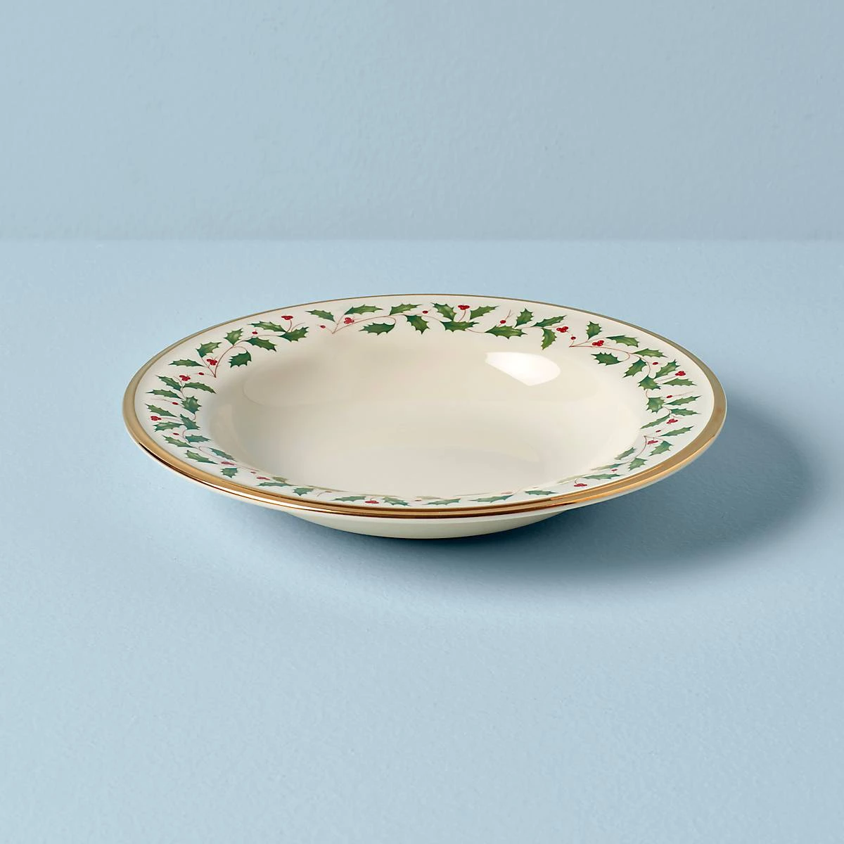 Part of the time-honored Lenox Holiday Dinnerware Collection, our holly and berry motif adorns the surface of the Holiday rimmed pasta bowl. Crafted from porcelain with a rich, 24-karat gold trim for an opulent, holiday-themed tableware addition.