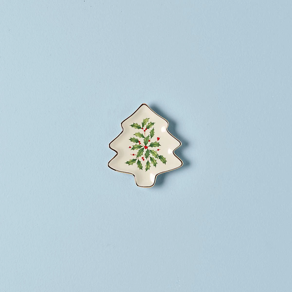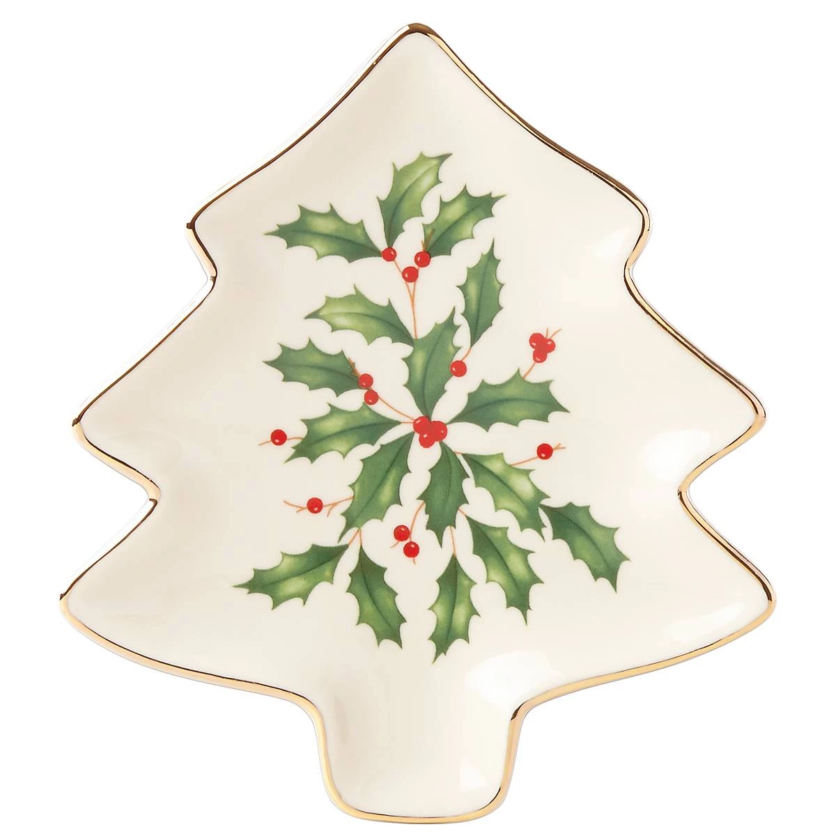 This ivory ceramic tree-shaped plate features the iconic Lenox holly and berries motif along with 24-karat gold accents on the outside border of the piece for shimmer and shine.