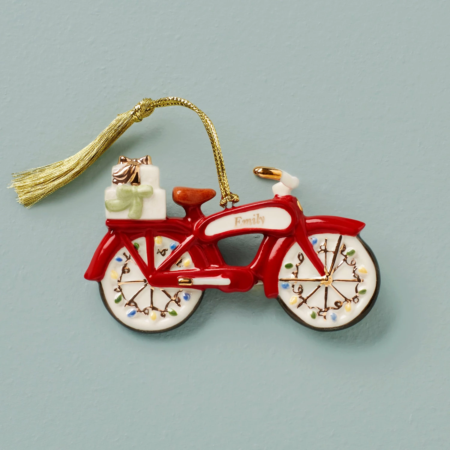 Make wonderful memories for someone dear to you with the fun and festive Personalized My Vintage Bicycle Ornament. Crafted in elegant porcelain and masterfully painted, this sweet ornament is accented in gold and can be personalized with a name up to 12 characters.
