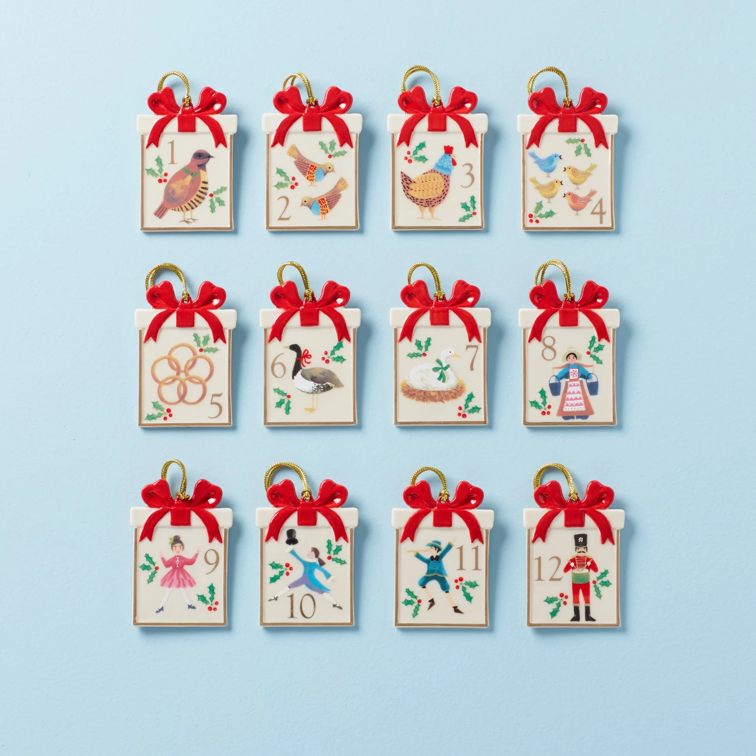 Countdown to Christmas with this delightful ornament set! Each gift box tells the story of the classic 12 Days Of Christmas song. Drummers drum, ladies dance and birds call on their own on these unique, hand-painted pieces featuring 24k gold detail. Decorate your tree with every ornament (or give it to your true love each day!)