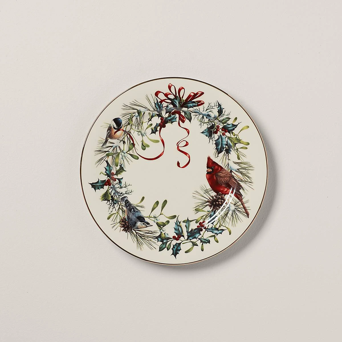 Our classic Winter Greetings Collection features peaceful birds perched amidst a motif of pinecone, holly and mistletoe. Crafted from durable porcelain with 24k gold accents, this 6-piece dinner plate set makes an artful addition to the holiday tabletop.