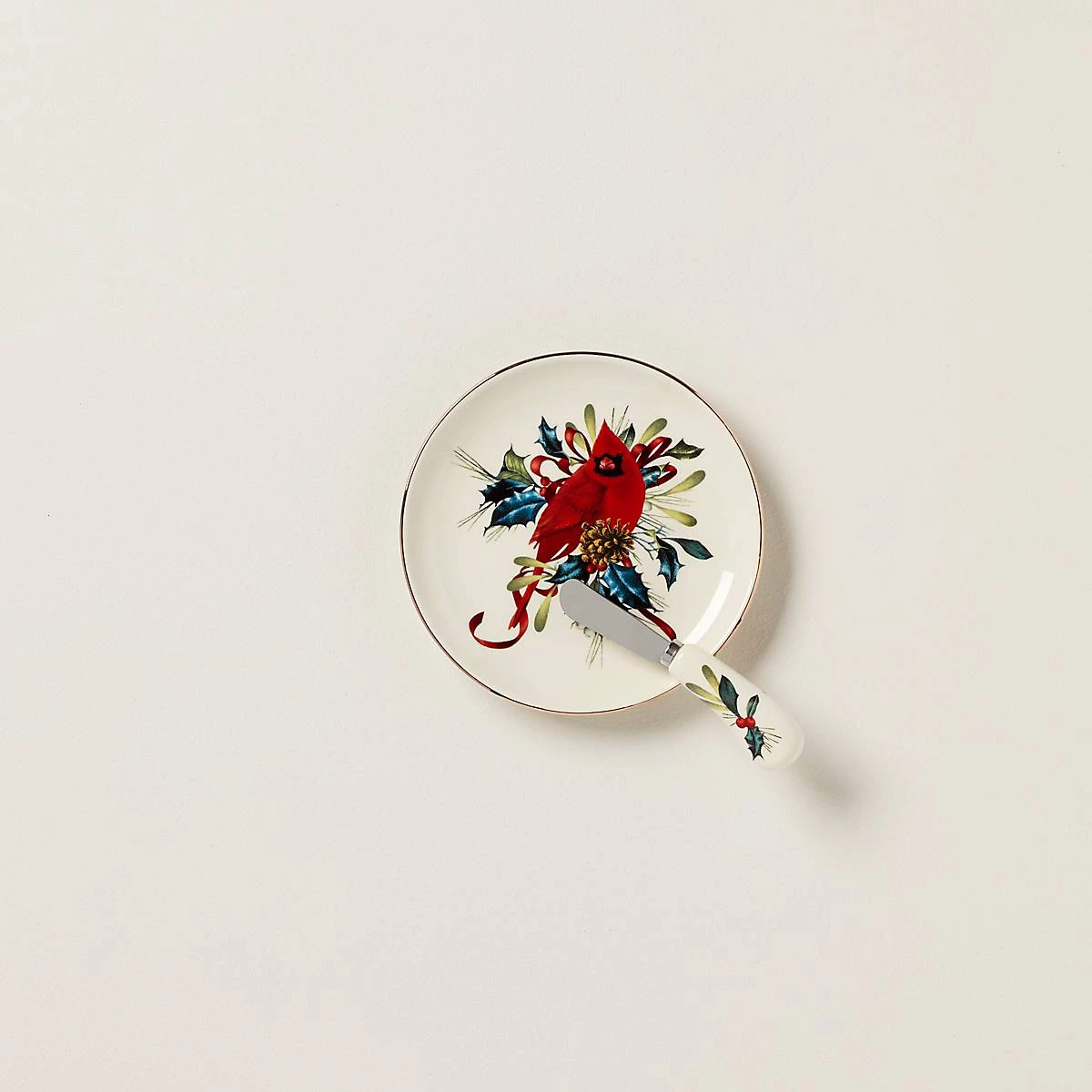 Festive and whimsical, this plate and cheese knife set features festive holly-patterned details along with a handsome red cardinal bird sitting in the center of the plate. Serve spreads, cheeses, and more with this 24-karat gold accented set.